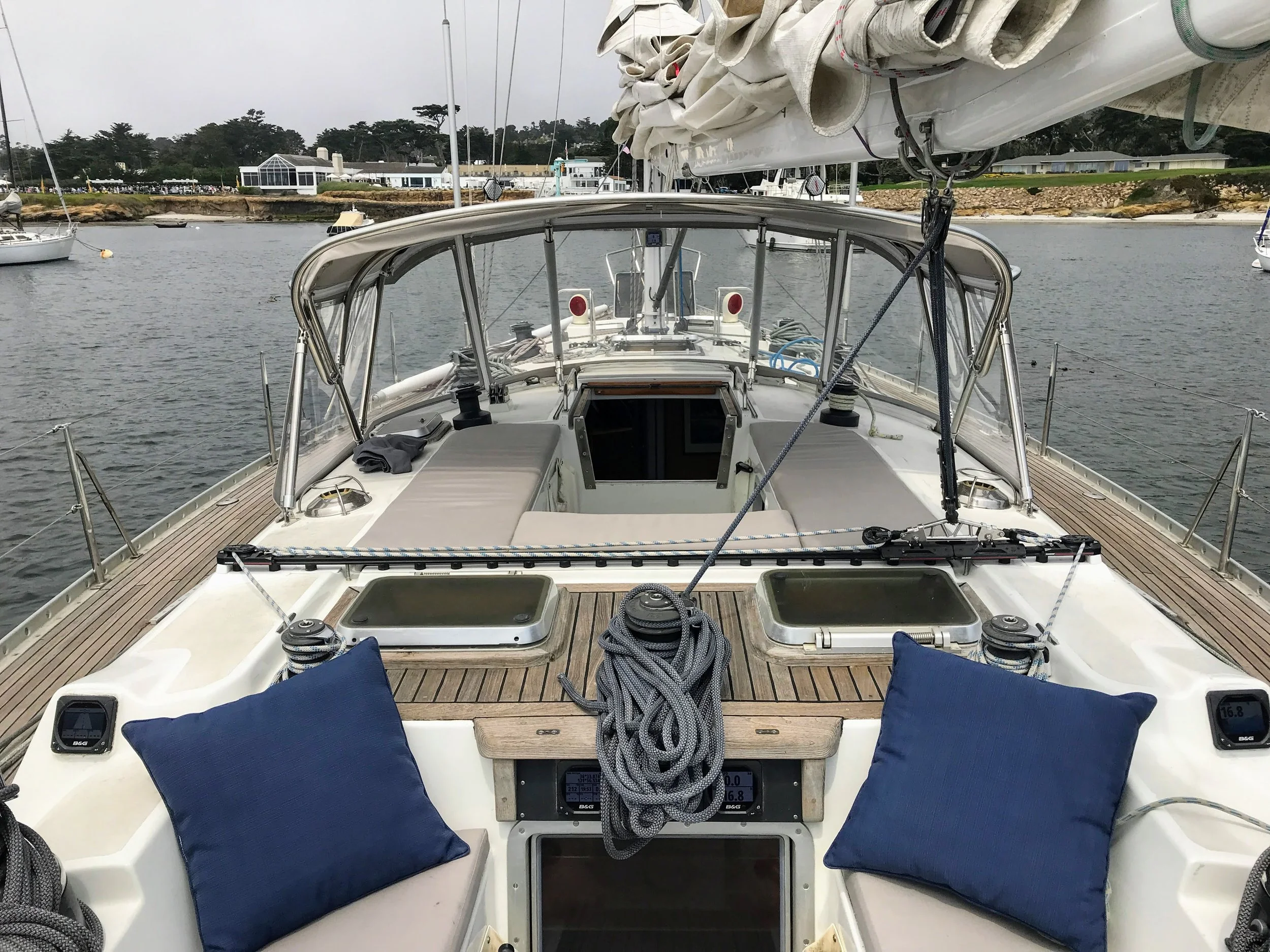 At 32,000 pounds, Atalanta glides through the ocean without pounding, but is still significantly lighter and more nimble than many cruising yachts her size. She is right at home on Monterey Bay and is now the proud flagship of Shearwater Sailing, LLC.